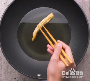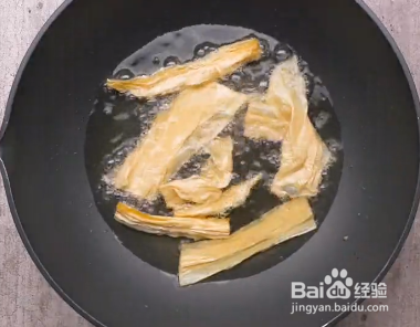 2.起锅烧油,油温6层热的时候转成小火,放入腐竹,炸至金黄,捞出备用