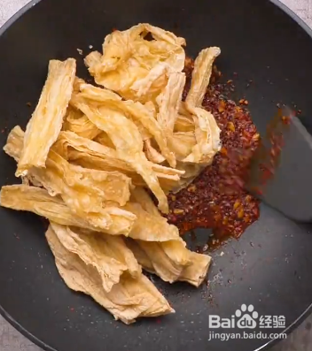 4.放进炸好的腐竹,翻炒均匀