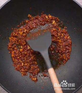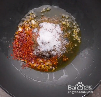 锅中留底油15g,放入香油,蒜末,姜末,辣椒粉,花椒粉,孜然,盐,糖,用小火炒出香味