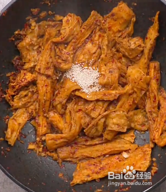 出锅前放进芝麻,继续翻炒均匀,然后就可以出锅了