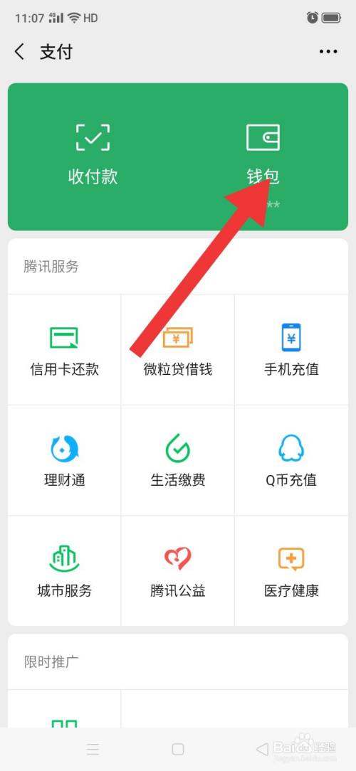 2、在“支付”页面,点击“钱包”。