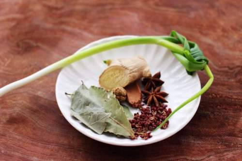 3准备好小葱,香叶和八角,花椒和肉蔻,姜和桂皮。