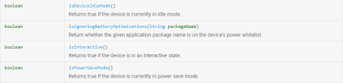 PowerManager和PowerManager.WakeLock还有很多方法,常用的有isHeld()方法用于判断wakelock是否以及释放,isInteractive()用于判断设备是否处于Iinteractive状态,isPowerSaveMode()等用于判断设备当前的是否处于节能状态。更多的请仔细阅读Andorid开发API,按需设计应用的休眠策略。