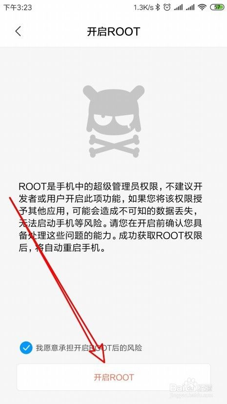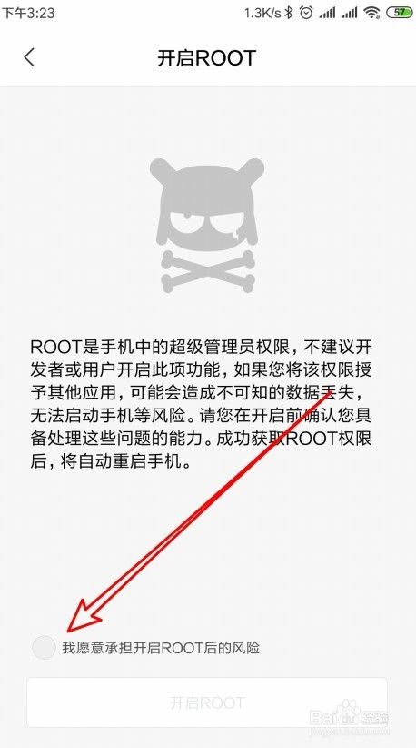 这时会打开红米Note4X的开启RooT权限页面,我们选中“我愿意承担开启RooT后的风险”前的选项。