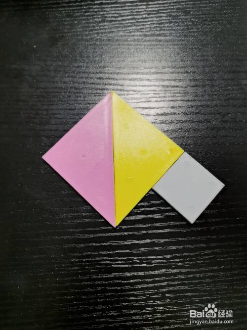 拿出一个白色正方形板放在黄色大号三角形板的右边,如图所示。