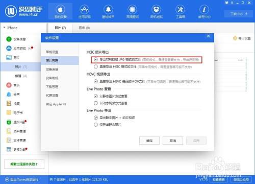 例如,iOS 11 及更新系统拍摄的照片为 HEIC 格式,如果您想在电脑中保存原来的格式,请您在设置中勾选“直接导出 HEIC”格式的文件,不过此格式为苹果专用,可能一些软件并不支持查看。您也可以根据需要选择“导出时转换成 JPG 格式的文件“,就可以在电脑中进行查看了。
