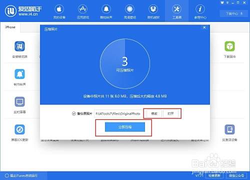 如果您仍然想要保留手机中的照片,以便随时查看,可以使用手机助手【工具箱】中的【压缩照片】功能来优化储存空间。