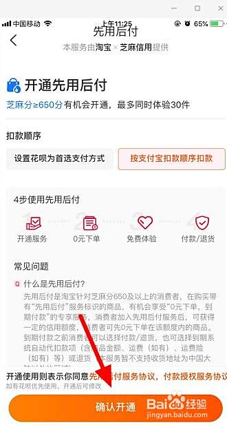 进入支付设置以后,选择【先用后付】功能,点击【确认开通】按钮,就可以开通淘宝的先用后付了。