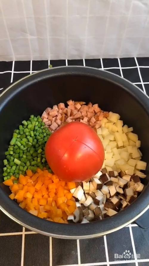 放入2克蒜苔丁,2克胡萝卜丁,2克香菇丁,2克土豆丁,2克香肠丁,再放入1个改好刀好的西红柿