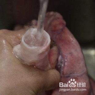 猪肺清洗干净,将喉管对着水龙头灌水,反复揉擦干净。