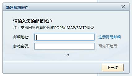 打开客户端单击左上角的“邮箱”然后点击下拉菜单中的“新建邮箱账户”按步骤输入邮箱账户和密码,点击下一步