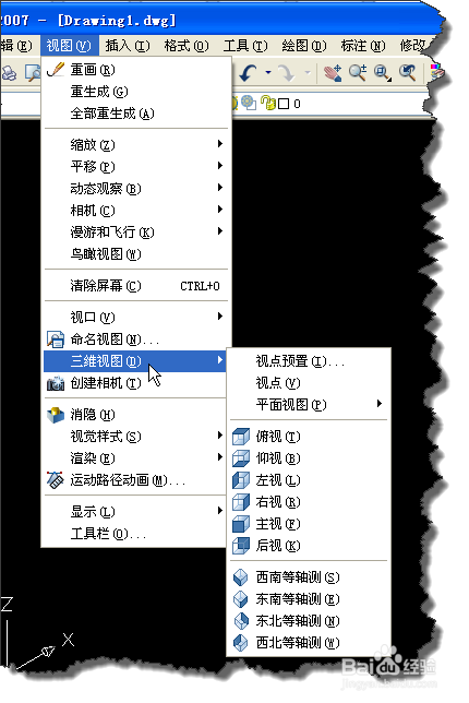 打开AutoCAD,在“视图”菜单下的“三维视图”命令下选择一个等轴图。如图所示。