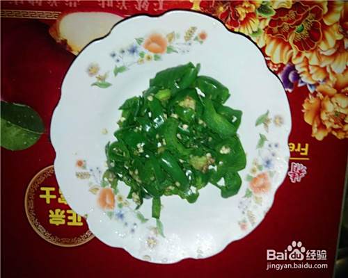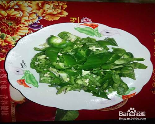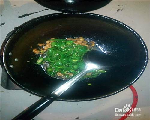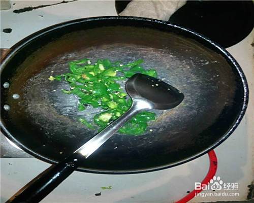 开火,锅里不放油,直接放入青椒,放点盐翻炒。