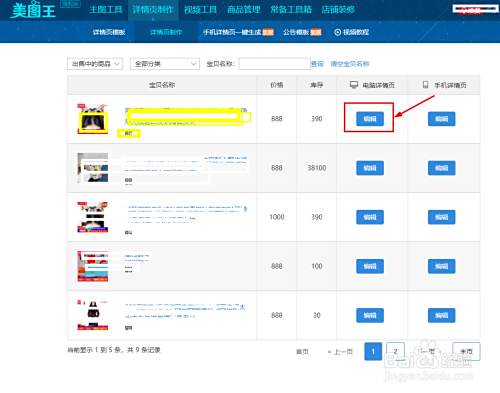 我们选择详情页制作,进入选择宝贝界面, 选中需要制作详情的宝贝,点击电脑端的详情页下方的编辑按钮进入编辑页。 (这里选择电脑端的话后边可以一键生成手机端。)选择一个合适模板开始制作详情页。 我自己是服装类目,所以我选一个做的好看的服装,可以先预览一下是否符合心意,然后点击开始使用即可。