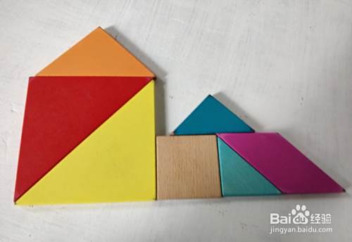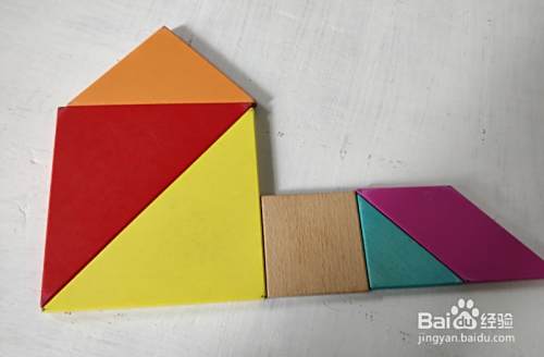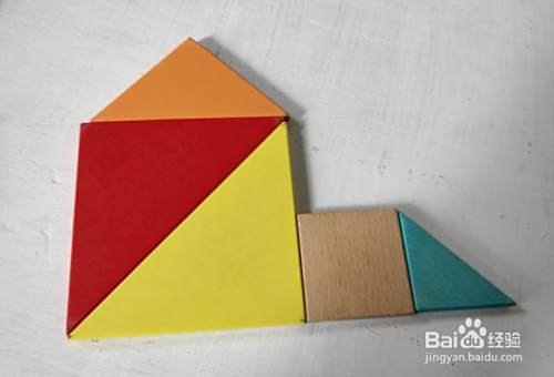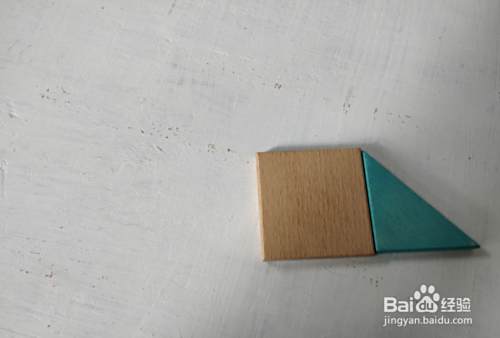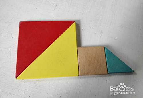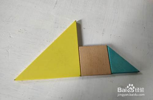 摆上黄色三角形,放在正方形左侧挨着,下端一齐,如图。