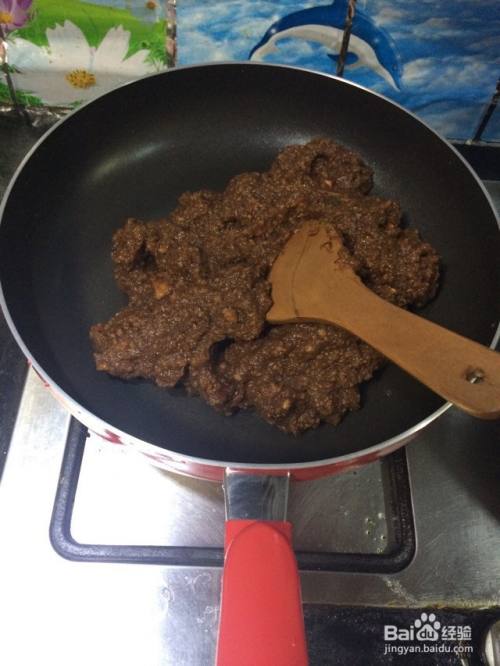 打好的枣泥加细砂糖,用中小火翻炒,分3次加入植物油,不断翻炒使油完成被吸收