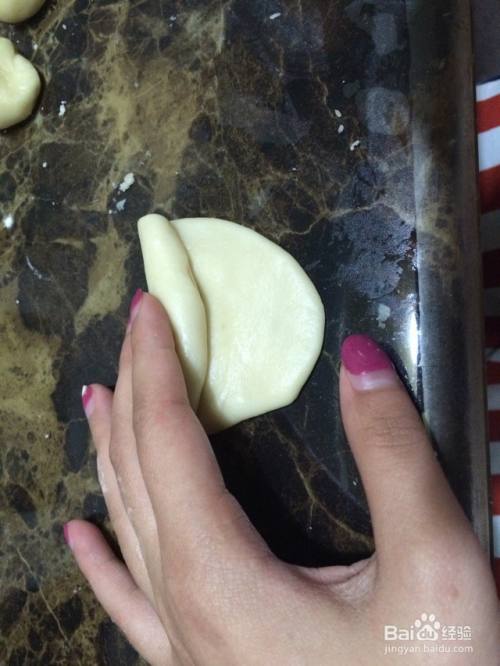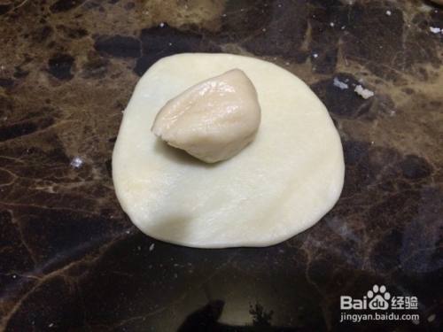 取一个面团擀成圆形,放入馅,包好,在用手压扁