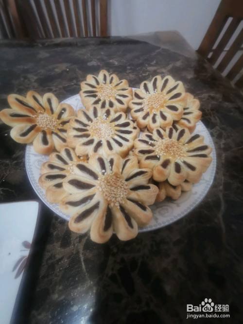 在中间涂上蛋黄,在撒上芝麻,预热后200度,中层20分钟左右,至到酥皮完全展开