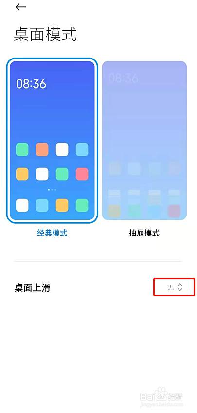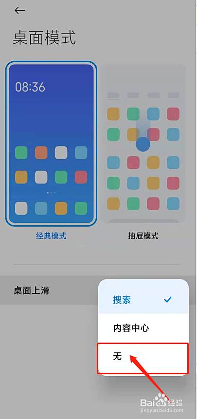在桌面上滑的选项中勾选无,此时上滑搜索就关闭了。