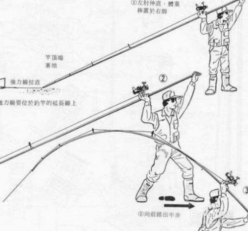 如果碰见大风天气,大仰角会使钓竿易受风的影响而摆动,这个时候就要把仰角减小,但也不能过小30°,否则会失去海竿应有的灵敏度;如果把仰角调小,还是无法解决受风影响的问题,可以将海竿收回几节,使竿高降低或是将海竿侧卧于岸边,但要注意使钓竿与钓线间夹角,尽量使之接近90°。
