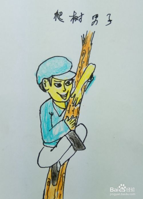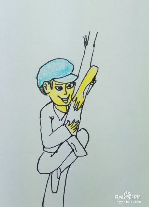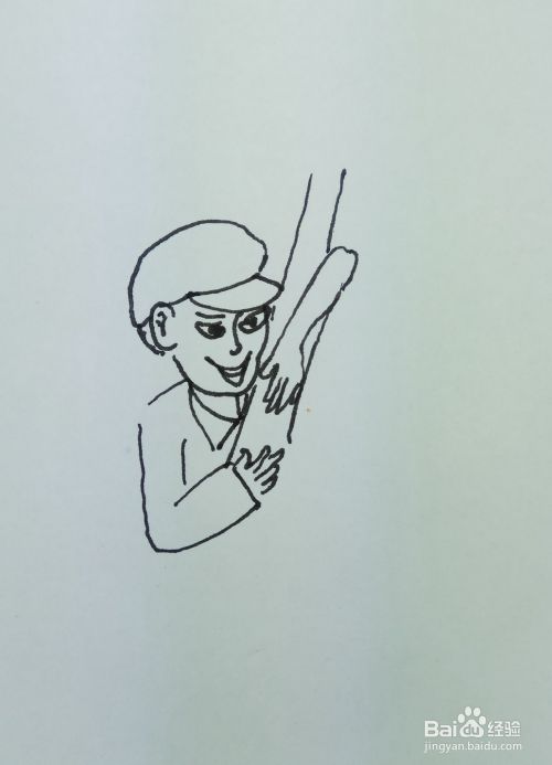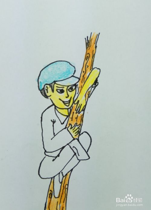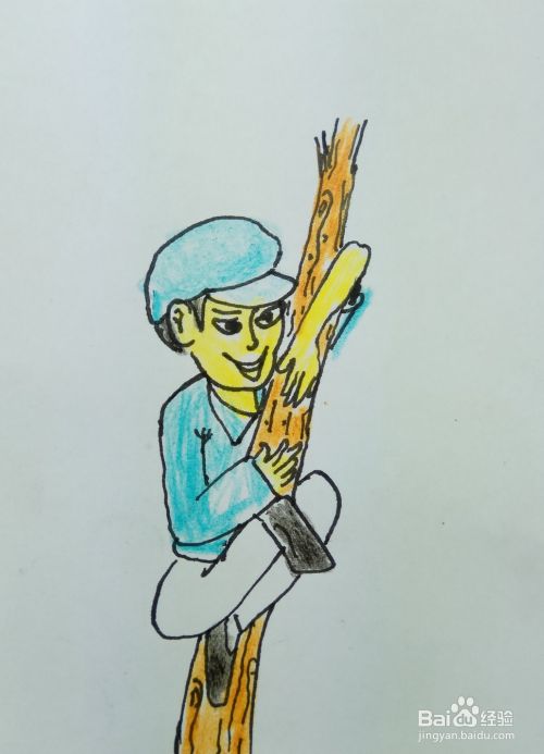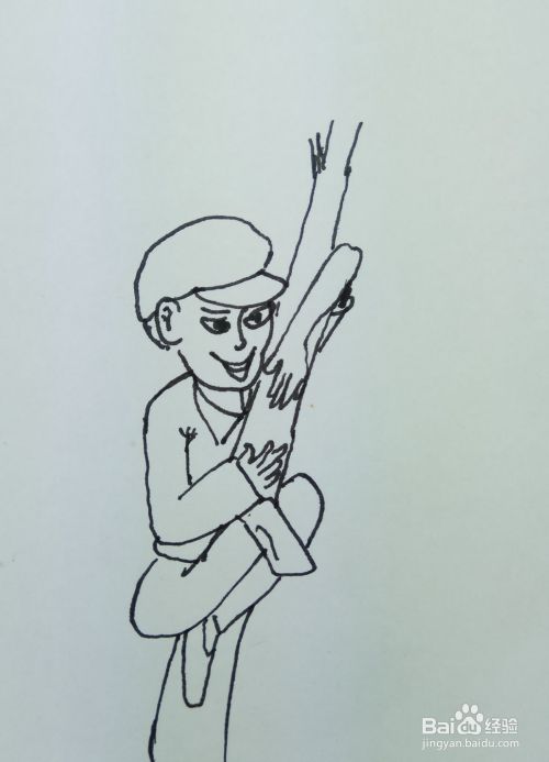 再用线条画出一个树干的形状和两个胳膊,他是用两个胳膊抱住了树干往上爬。