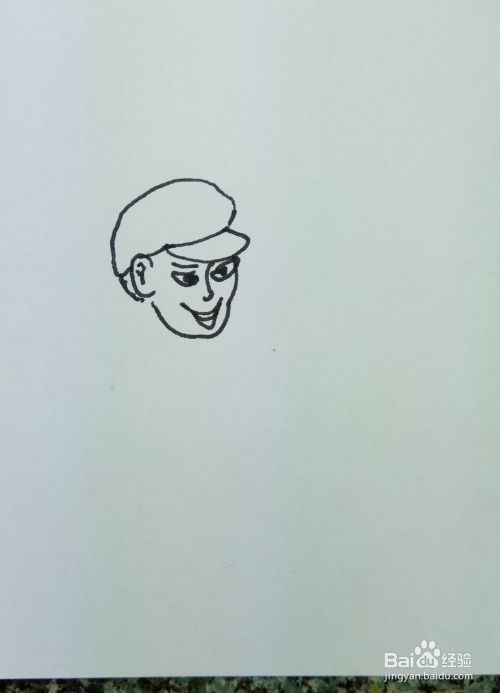 在白纸上用线条和曲线画出一个小男孩的头部轮廓,然后再画出他的眼睛,鼻子,嘴巴,耳朵部分,再用曲线画出他头上戴着的一个带帽檐的帽子。