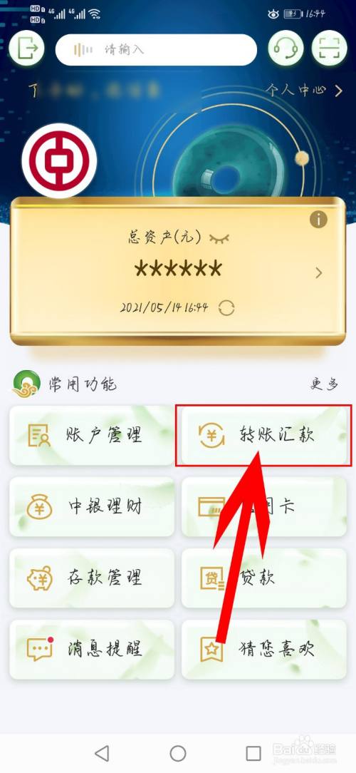 打开手机上的中国银行,登录自己的账号,点击“转账汇款”功能