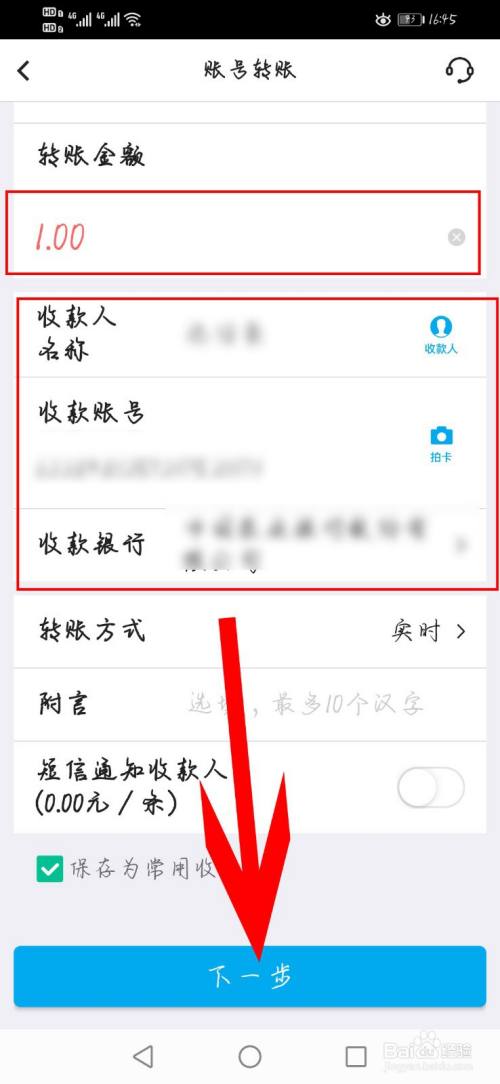 接下来输入转账金额,转账人姓名、账户,填写完毕点击“下一步”