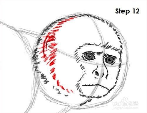 第12步:在脸部的左侧,为猴子的耳朵绘制曲线,为毛发绘制更快,更短的笔画。