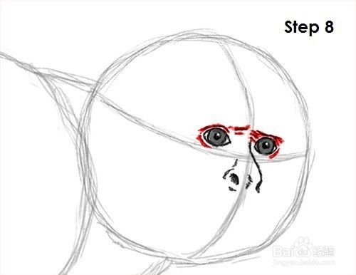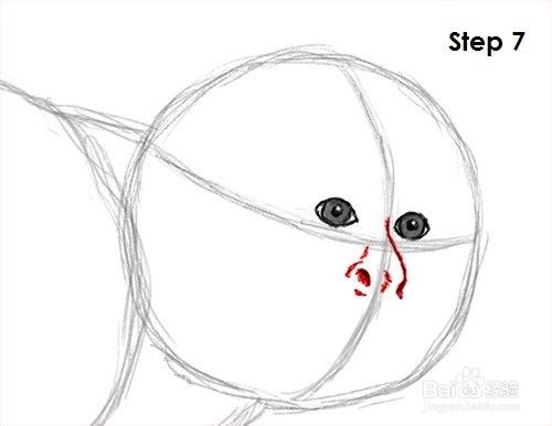 第七步:在两条指引线相交的区域下画出猴子的鼻子。鼻子由鼻梁右侧的曲线和鼻孔左侧的阴影椭圆组成。在猴子的鼻子周围画几条线作为结构。