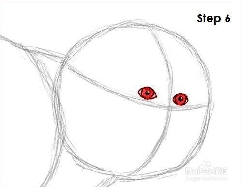 第6步:使用线条作为放置指南,在头部内部绘制猴子的眼睛。眼睛的形状与足球相似。在每只眼睛内画一个小圆圈来表示眩光。然后画出另一个圆圈,并为其瞳孔遮光。让猴子眼睛的轮廓更加黑暗,并在眼球的其余部分遮住。