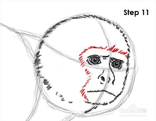 第10步:用原来的圆圈作为画猴头的指南。弯曲头部右侧的线条以创建颧骨和下巴。在另一边使用快速,短的笔触来表示皮草。