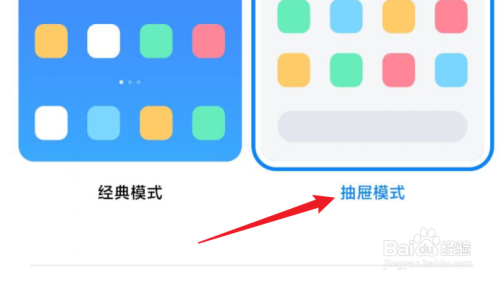 在“桌面模式”页面中,点击选择“抽屉模式”。