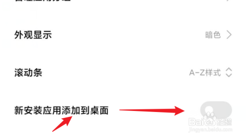 最后,将“抽屉模式”下的“新安装应用添加到桌面”右侧的开关按钮打开即可。