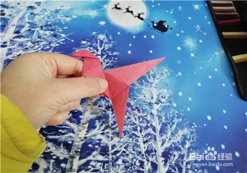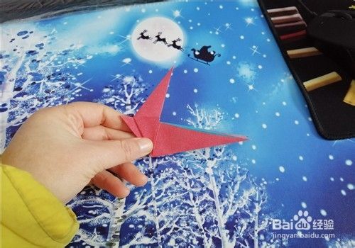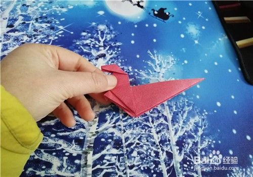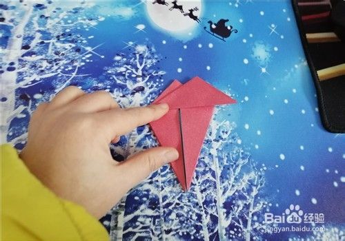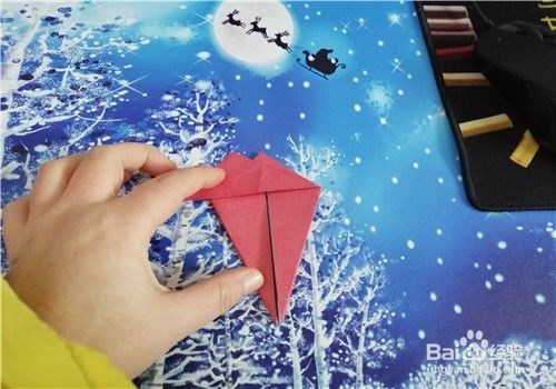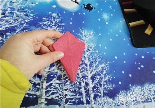 把角翻到上边,把角向左向右互折,然后把彩纸从中间向后折,如图三。