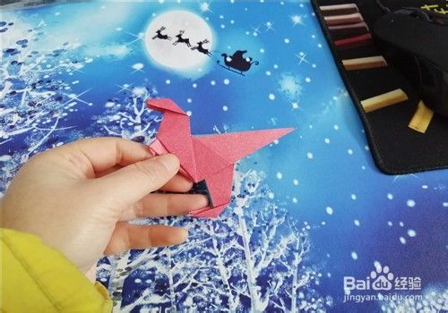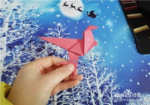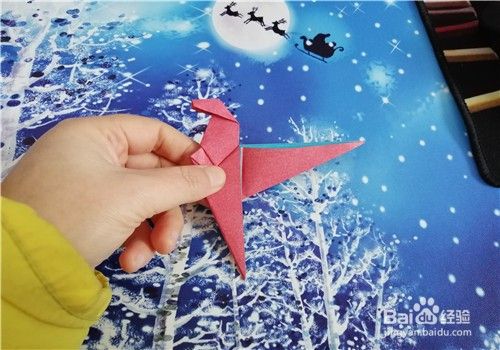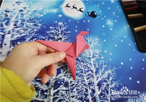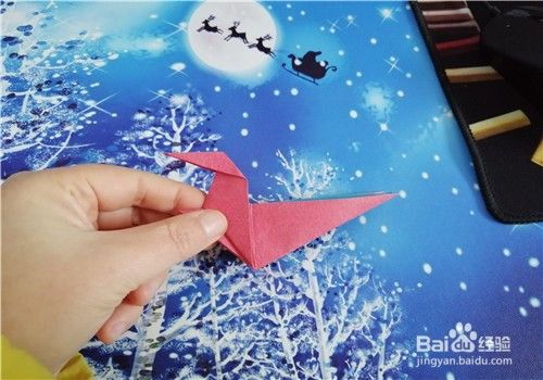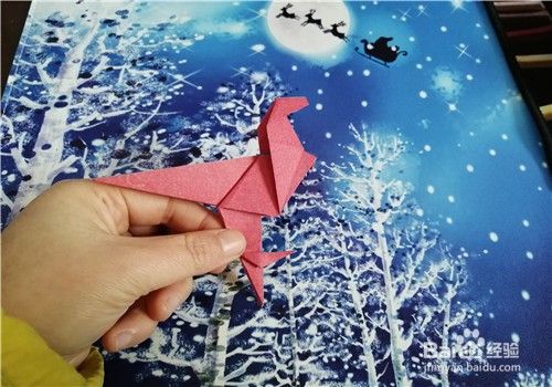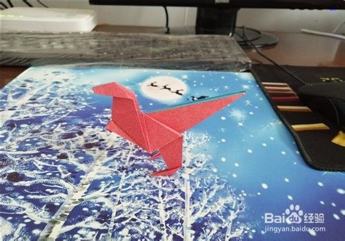 把下面的两个角向前折,与顶部的边平行,一只可爱的小恐龙就做好了,下面是完成图。