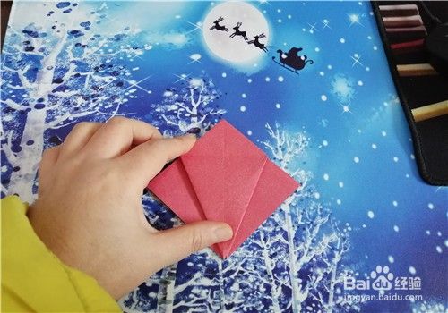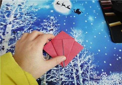 把上面的角向左折,并把尖角折到里边去,把中间的角向下折,如图所示。