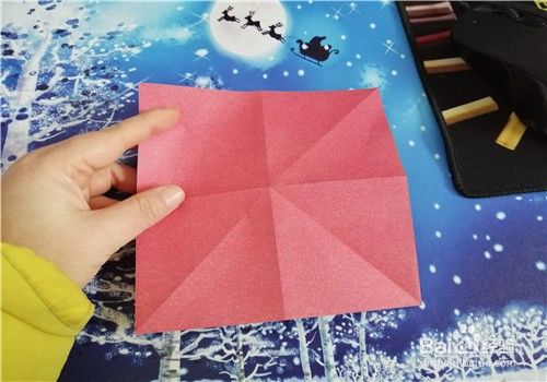 先把彩纸的中间折出米字形,再按照折痕把边向内收就成了图二的样子。然后把两侧的边向内折,如图。