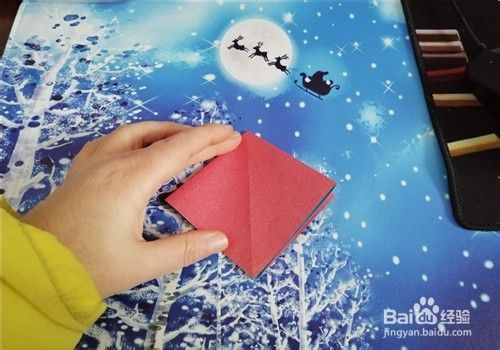 把彩纸打开,把边向内折,如图一。把上面的角向下折,翻到背面,同样操作,如图三。