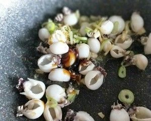 倒入小墨鱼仔煸炒一下,加一勺料酒。加一勺蚝油翻炒片刻。