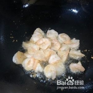 在锅中倒入较多的油,将虾仁过油2分钟,变成粉红色后捞出。