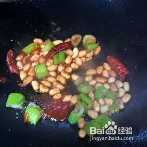 倒出多余的油,只留一点点底油,加入大葱、干辣椒、花生爆香,加入一大勺番茄酱,3小勺糖、3小勺醋。