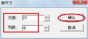 在弹出的“表尺寸”窗口中输入“行数”为“23”,输入“列数”为“4”,如图完成后单击“确认”。