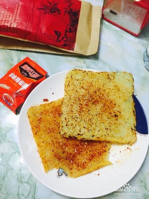 最后,开大火,把饼的两面都煎至呈金黄色就可以了,在饼的表面上撒上辣椒粉、芝麻