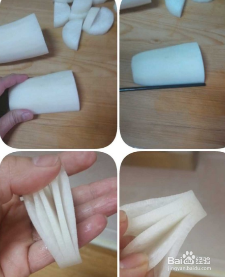 将萝卜横竖切四等份,依次将萝卜切连刀,前四刀不要切断,第五刀再切断,如图所示。防止切段的方法是在萝卜侧面放一根筷子。