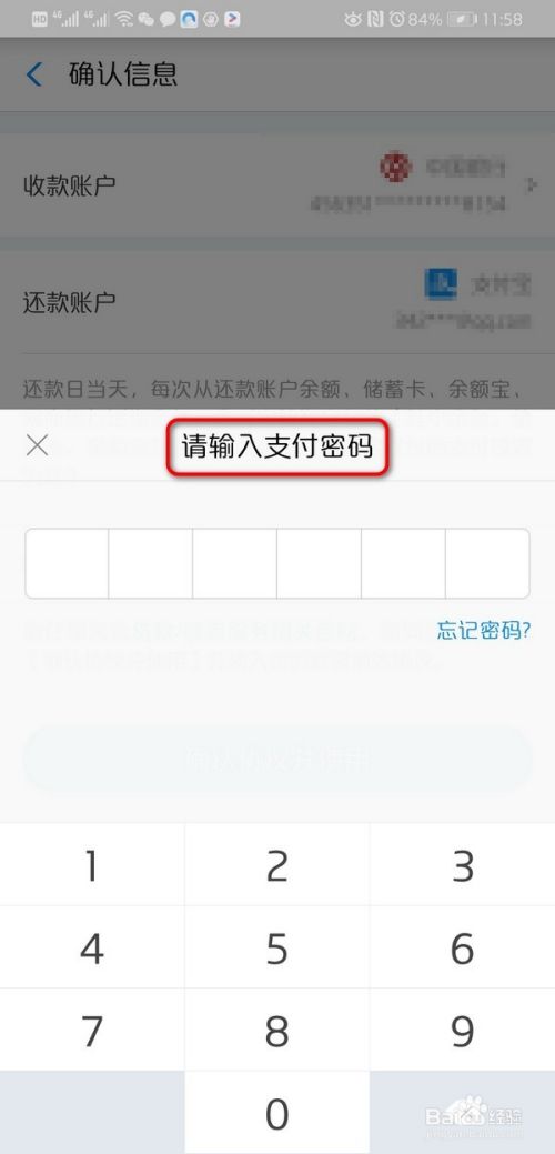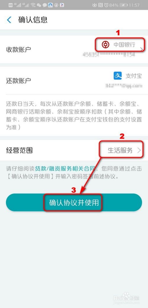 页面跳转到确认信息界面,选择收款账户,再选择经营范围,最后点击确认协议并使用。