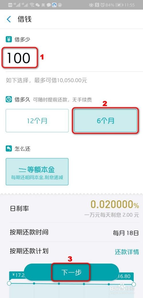 进入借钱界面,输入借款金额,选择期数,点击下一步。