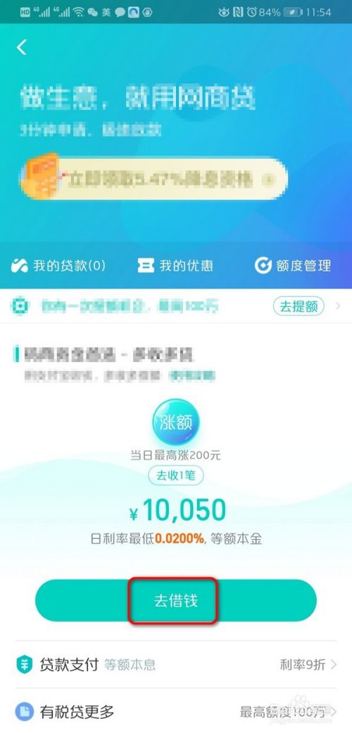 进入网商贷界面,系统会自动核算能借的金额,点击去借钱。