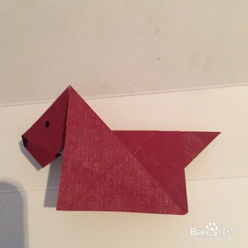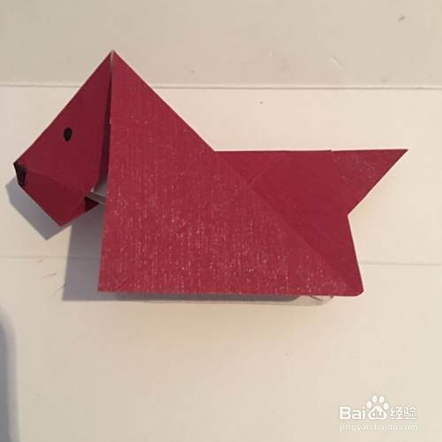 第六步 折叠完之后 把两个三角放下来 再把折缝里的小狗嘴部拿出来 然后画上黑鼻头和眼睛就行了