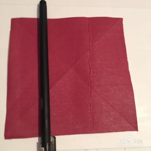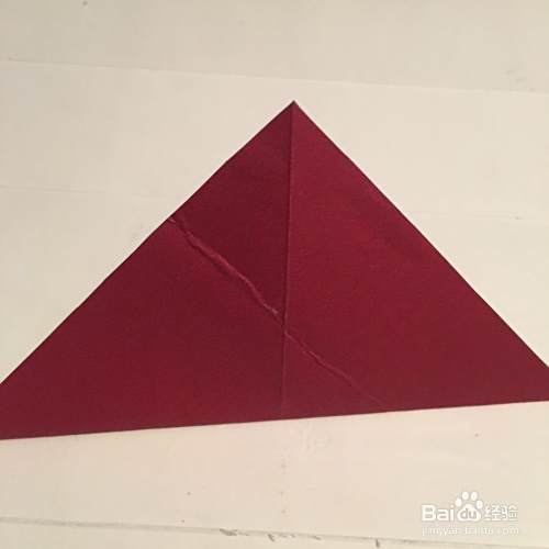 第一步 把一张12厘米X12厘米的紫色彩纸 从下向上对角折叠 然后再从左向右对角折叠